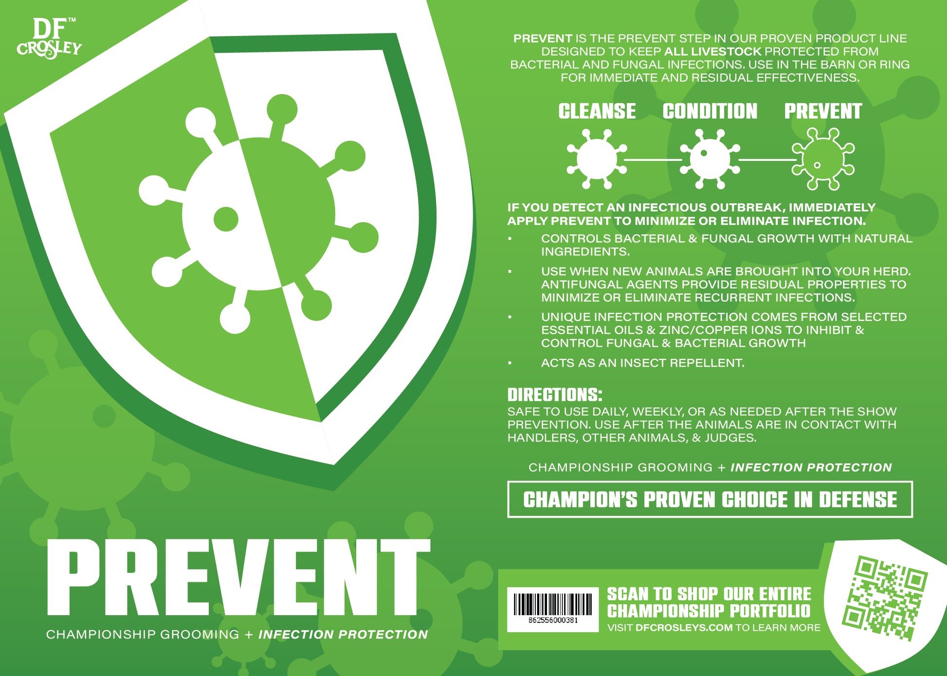 Prevent is the PROTECT step, designed to keep livestock protected from bacterial and fungal infections. If infectious outbreak is detected, immediately apply to minimize or help eliminate infection. Recommended for use when new animals are brought into herd. Antifungal agents provide residual properties to help reduce recurrent infections. Selected essential oils and zinc/copper ions inhibit and control fungal and bacterial growth. Recommended for use on cattle, hogs, sheep, goats and horses. Use this product in the barn, show ring or anywhere in-between for immediate effectiveness.